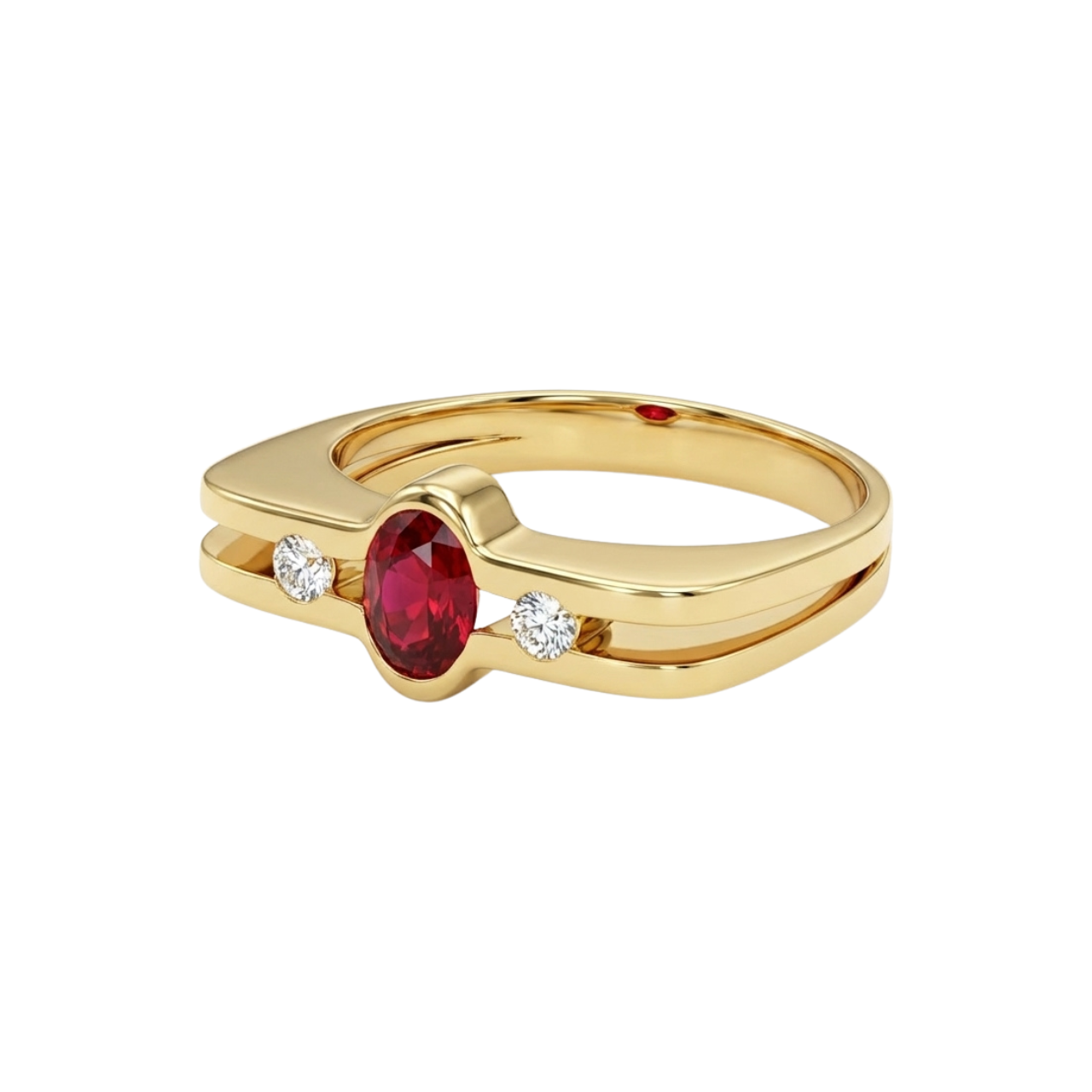 Un classico rivisitato, con una forma dalla forma particolare e moderna. Un anello in oro giallo 750/1000 con un rubino centrale da 0,7 carati e due diamanti laterali ciascuno da 0,05 carati.