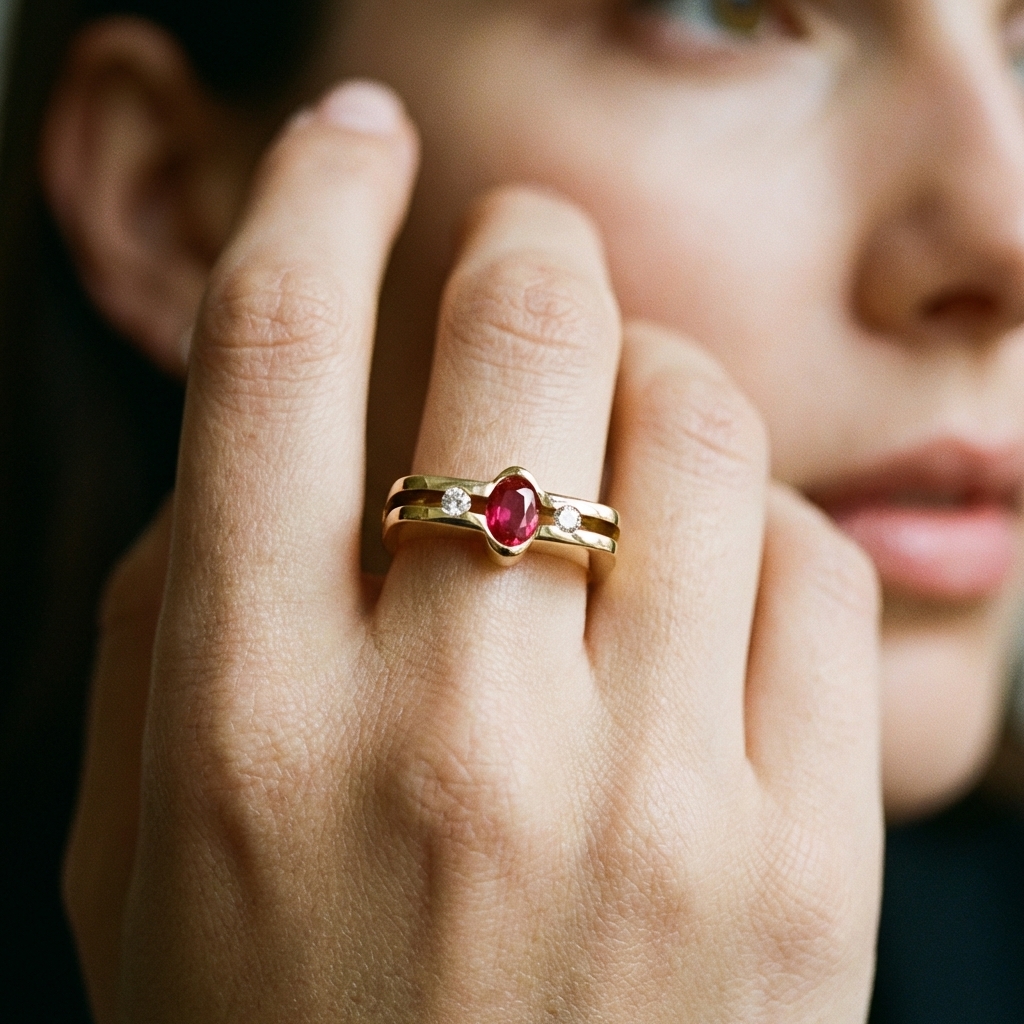 Anello oro giallo moderno con rubino centrale e diamanti
